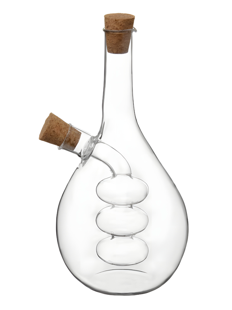 Особенностью бутылки является наличие двух отделений: для масла и уксуса. Это позволяет вам экономить место на столе, так как не нужно держать отдельно масло и уксус.