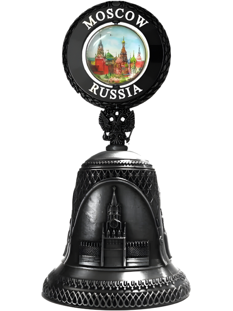 На колокольчике изображены рельефные изображения Спасской башни и Храма Христа Спасителя, что придает ему особую уникальность и привлекательность.