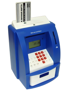 Эту удивительную электронную копилку можно использовать в качестве персонального электронного банка. Корпус игрушки оснащен ЖК-дисплеем и кнопочной цифровой панелью. Банкомат способен подавать сигналы посредством звука и света. В нижней части корпуса размещен сейф на электронном замке, открыть его возможно лишь пластиковой карточкой, кроме того, необходимо ввести заданный пин-код. Устройство может принимать как монетки, так и бумажные купюры, но для них предусмотрены различные отверстия. Размер вклада банкомат сохраняет в автоматическом режиме, поэтому вы в любой момент можете посмотреть, какая сумма накоплена.