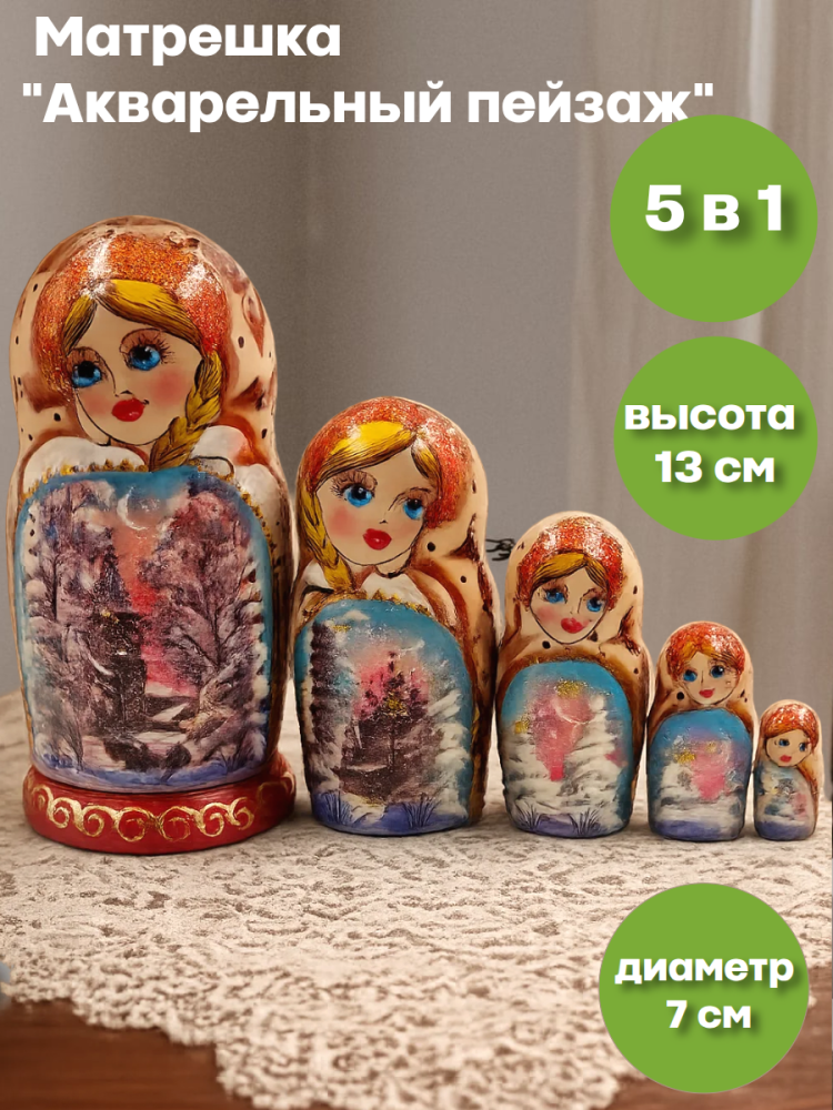 Матрешка "Акварельный пейзаж" (5 мест, 13 см) - описание товара