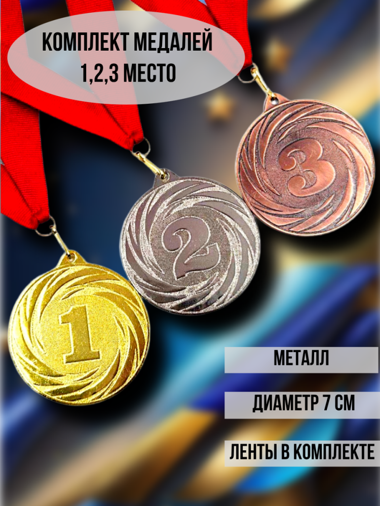 Комплект медалей 1, 2, 3 место — это отличный выбор для награждения участников соревнований или конкурсов. На изображении представлены три медали: золотая, серебряная и бронзовая, каждая из которых имеет диаметр 7 см и выполнена из металла.