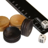 В набор входят доска, 30 фишек и два зарика. Внешний рисунок выполнен в виде резьбы, а внутренний — в технике выжигания. Лузы для фишек предусмотрены, углубления в них также имеются.