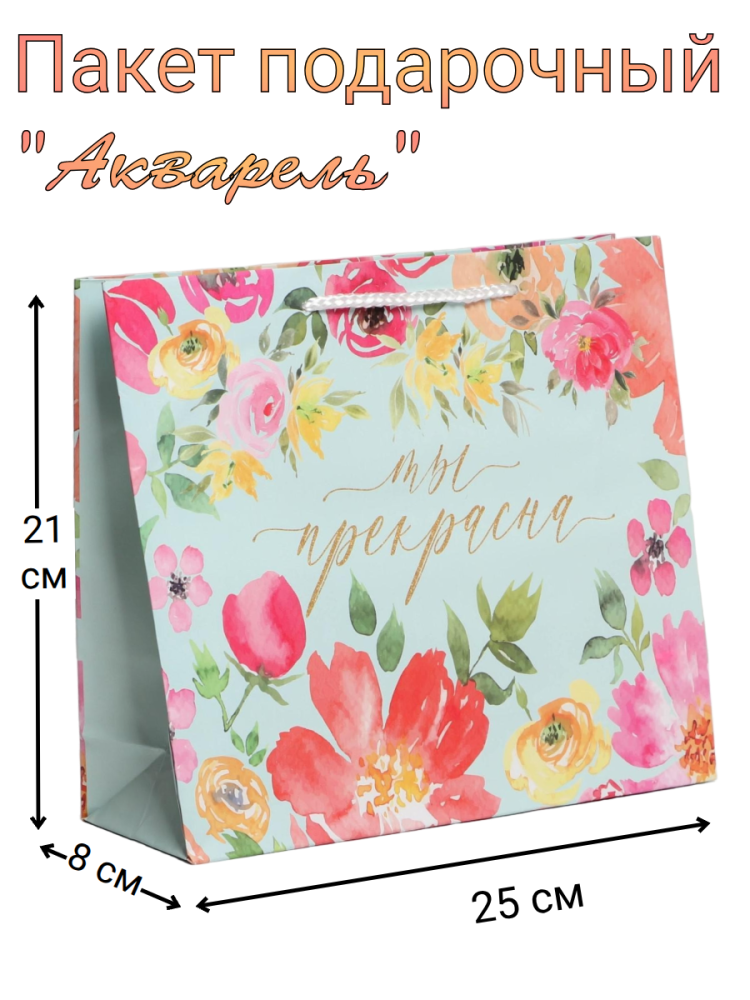 Подарочный ламинированный пакет « Акварель » Превратите любой подарок в настоящий праздник с элегантной упаковкой — подарочным пакетом « Акварель »! Стильная и прочная упаковка подчеркнёт ваше внимание и заботу, сделав момент вручения особенно запоминающимся. Основные характеристики: Размер: 21 × 25 ×8  см (высота × ширина × глубина) — подходит для разнообразных подарков: от небольших сувениров до косметических наборов и сладостей. Материал: плотная бумага  с ламинацией — обеспечивает прочность и долговечность, защищает содержимое от мелких повреждений и влаги. Отделка: ламинация — придаёт пакету глянцевый блеск, делает цвета более насыщенными и яркими. Ручки: удобные ручки‑шнуры — надёжно прошиты, выдерживают вес до 700 г , позволяют комфортно переносить подарок. Дизайн:  нежное  изящное  оформление  — лаконичный и универсальный стиль подойдёт для любого торжества. 90