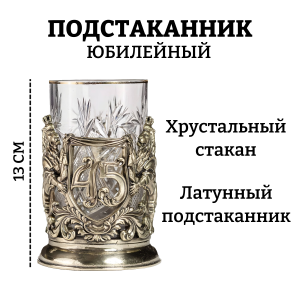 Латунный подстаканник "Юбилейный. 45 лет" с хрустальным стаканом – это изысканный и практичный подарок для любителей чая и ценителей ручной работы. Изготовленный из высококачественной латуни с последующим патинированием, этот подстаканник обладает особым шармом и духом старины.