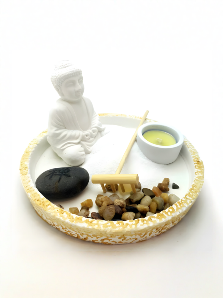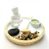 В состав набора входят: подставка размером 18 х 18 х 2,5 см, статуэтка размером 9 см, грабельки, свеча с подставкой, камни и песок. Общий вес набора составляет 910 граммов.