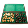 Доска для игры выполнена из дерева и шпона темных и светлых пород дерева, что придает ей прочность и долговечность. Внешний рисунок - маркетри (инкрустация), что делает каждую доску уникальной.
