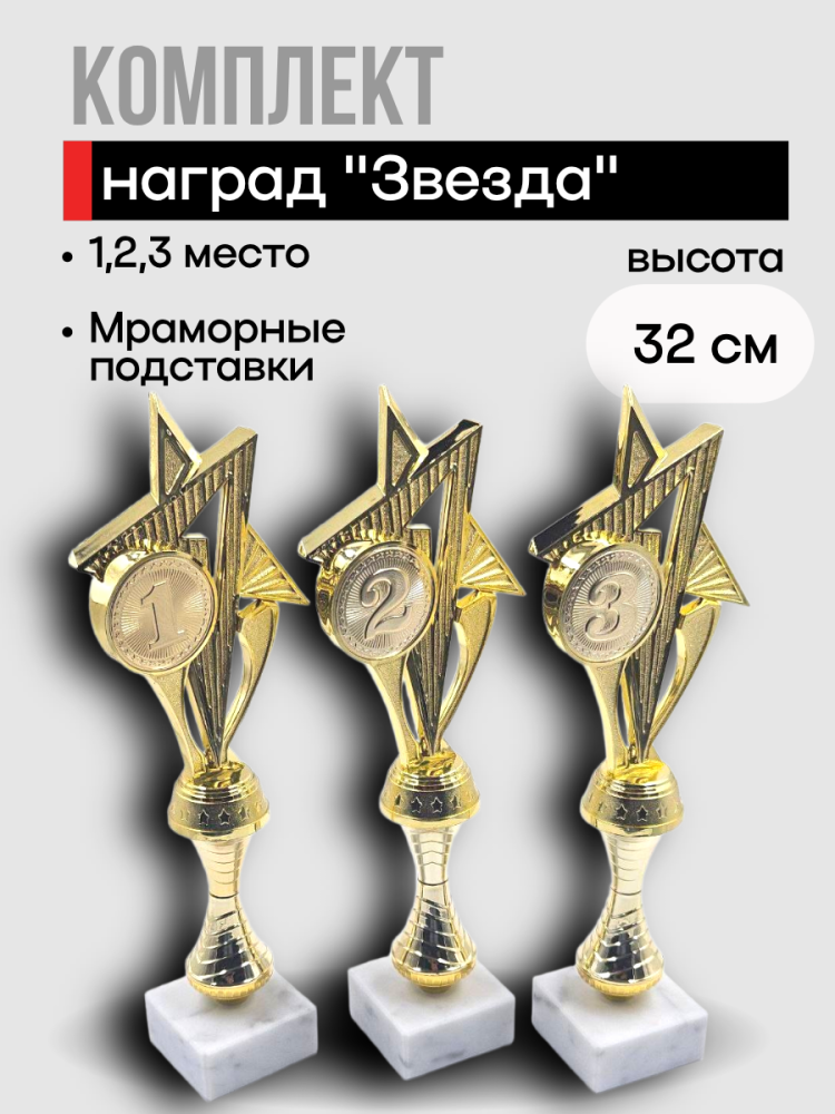 Комплект наградных кубков с эмблемами за 1,2,3 место "Звезда" (32 см) - описание товара