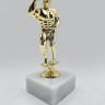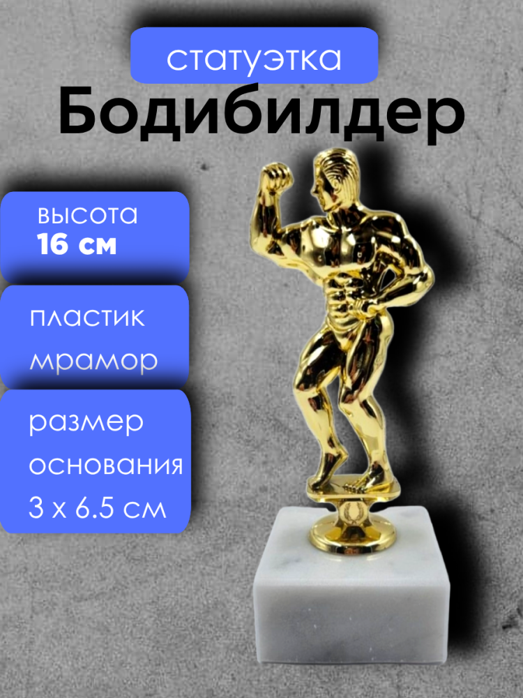 Статуэтка высотой 16 см выполнена в виде мускулистого бодибилдера, изображенного в динамичной позе. Фигурка изготовлена из пластика с золотистым покрытием, что придает ей элегантный и торжественный вид. Она установлена на мраморной подставке, которая подчеркивает её статусность и устойчивость.