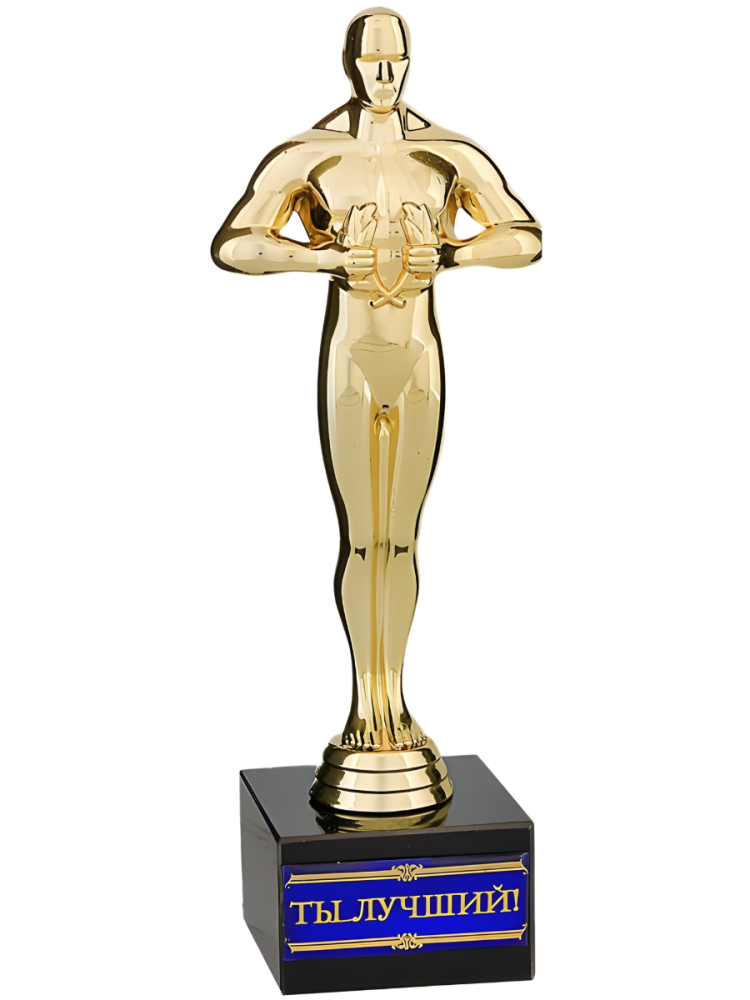 Статуэтка выполнена в виде копии награды Американской киноакадемии "Оскар", что делает ее уникальным и запоминающимся подарком. Размеры статуэтки составляют 18 х 6,5 х 6,5 см, что делает ее достаточно заметной и привлекательной.