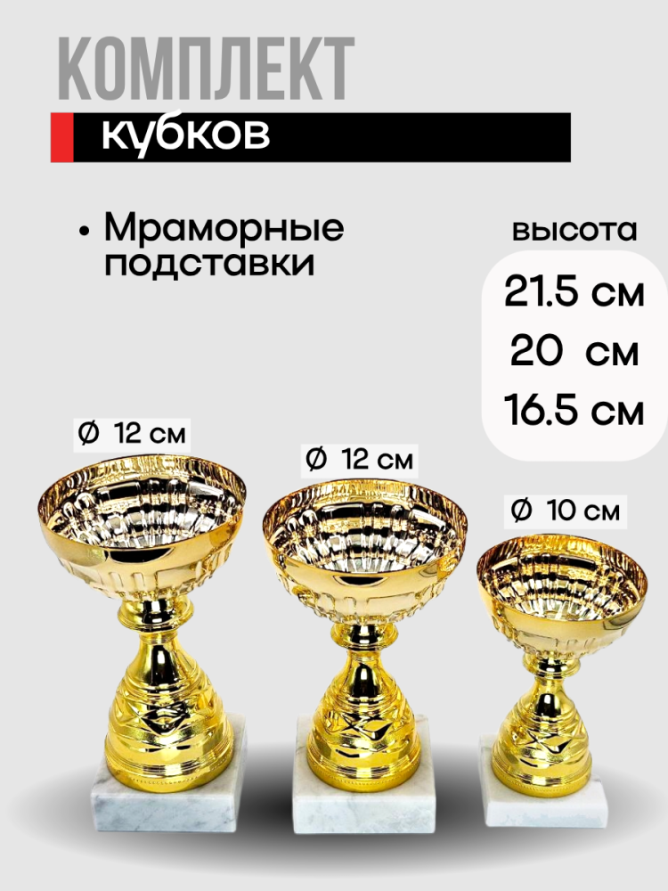 - Размеры: В комплекте представлены три кубка разной высоты (21,5 и 20 и 16,5 см), что позволяет награждать участников за 1, 2 и 3 места.