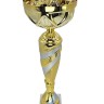 Этот элегантный наградной кубок высотой 27 см и диаметром чаши 10 см выполнен из металла с золотистым покрытием, что придает ему роскошный и торжественный вид. Чаша кубка украшена изысканным декором в виде ручек колосьев, которые плавно переходят от основания к краям, создавая эффект утонченности.