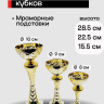 Материалы: Чаши кубков выполнены из металла, что придаёт им прочность и долговечность.Подставки изготовлены из мрамора, что добавляет изысканности и торжественности.