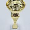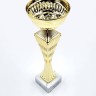 Этот элегантный наградной кубок высотой 28.5 см и диаметром чаши 10 см выполнен из металла с золотистым покрытием, что придает ему роскошный и торжественный вид.