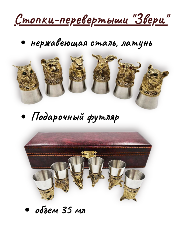 Набор стопок-перевертышей "Звери" - это уникальный и стильный подарок для любителей крепких напитков. Изготовленные из качественной пищевой нержавеющей стали и латуни, эти стопки обеспечивают долговечность и надежность в использовании.