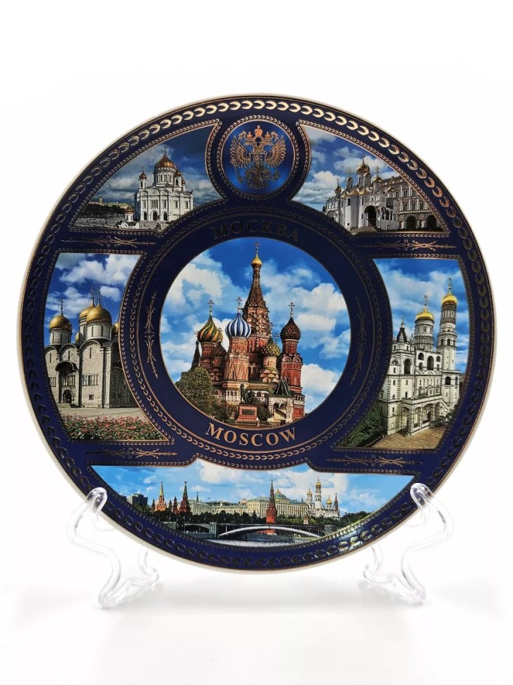 Тарелка выполнена в синем цвете, который добавляет ей элегантности и утонченности. Тематика городов и герба России делает ее отличным подарком для любителей путешествий и истории.
